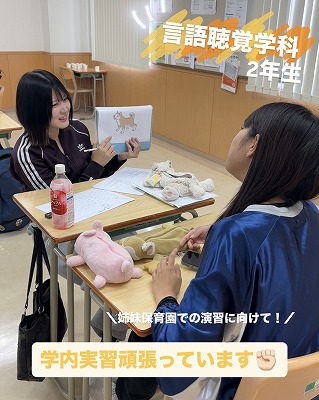 1年生の時に姉妹保育園で園児たちと触れ合った経験を思い出しながら、子どもたちの反応を想定して練習を行いました☺️