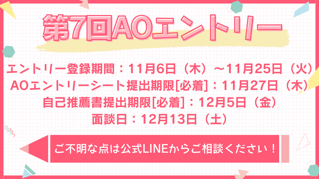 AOエントリーをご検討中の方は、上記の日程を確認の上、準備を進めてくださいね✨